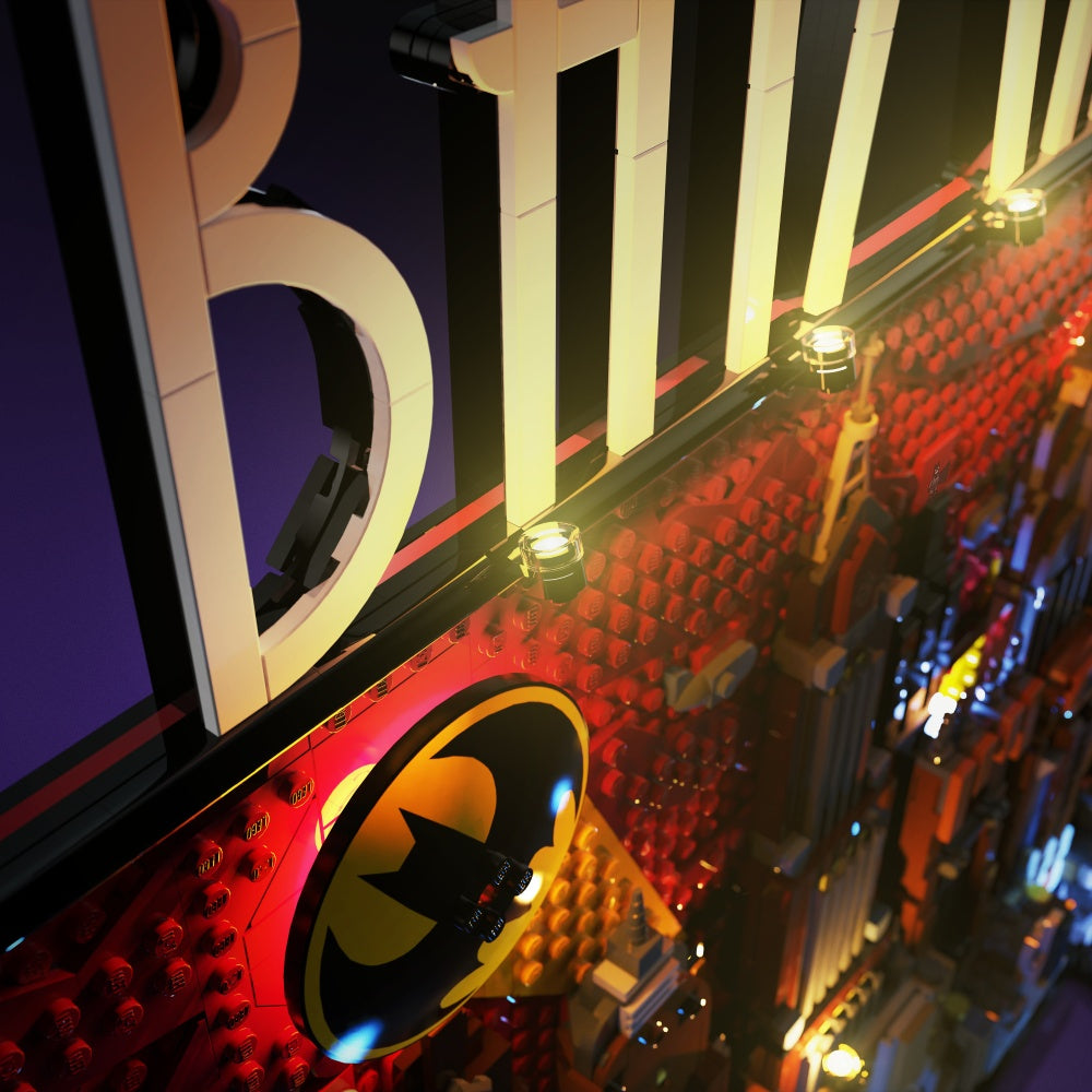 24 Lichter wurden rund um die "dunkle Deco"-Stadtansicht und -landschaft verteilt, von den hoch aufragenden Wolkenkratzern bis zu Wayne Manor, der Ace Chemical Processing Plant und natürlich dem ikonischen Bat-Signal.