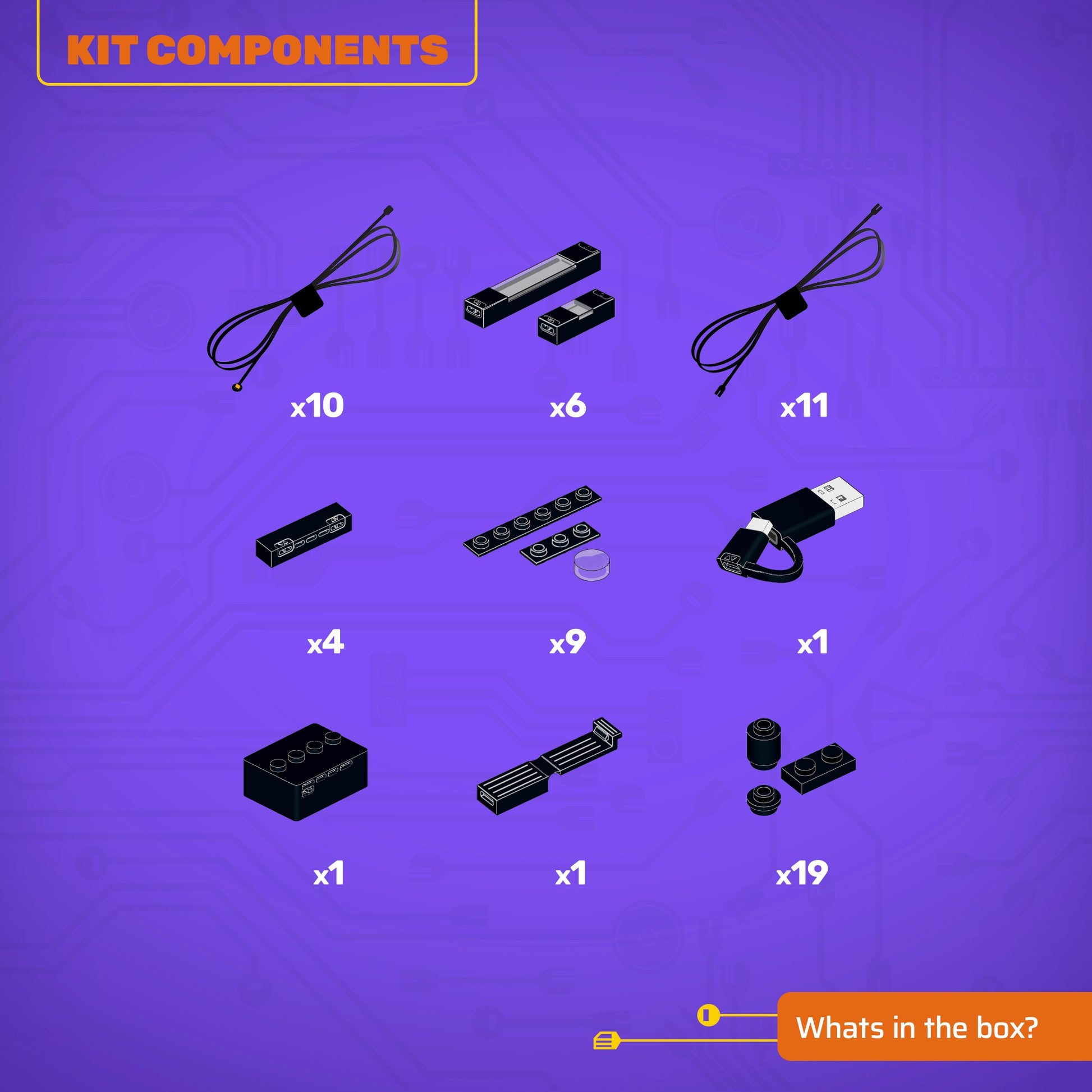 • Alle Gehäuse und Abdeckungen der Komponenten wurden so entworfen, dass sie nahtlos mit dem LEGO-Noppen-System verbunden werden können, mit LEGO-dimensionierten Teilen.