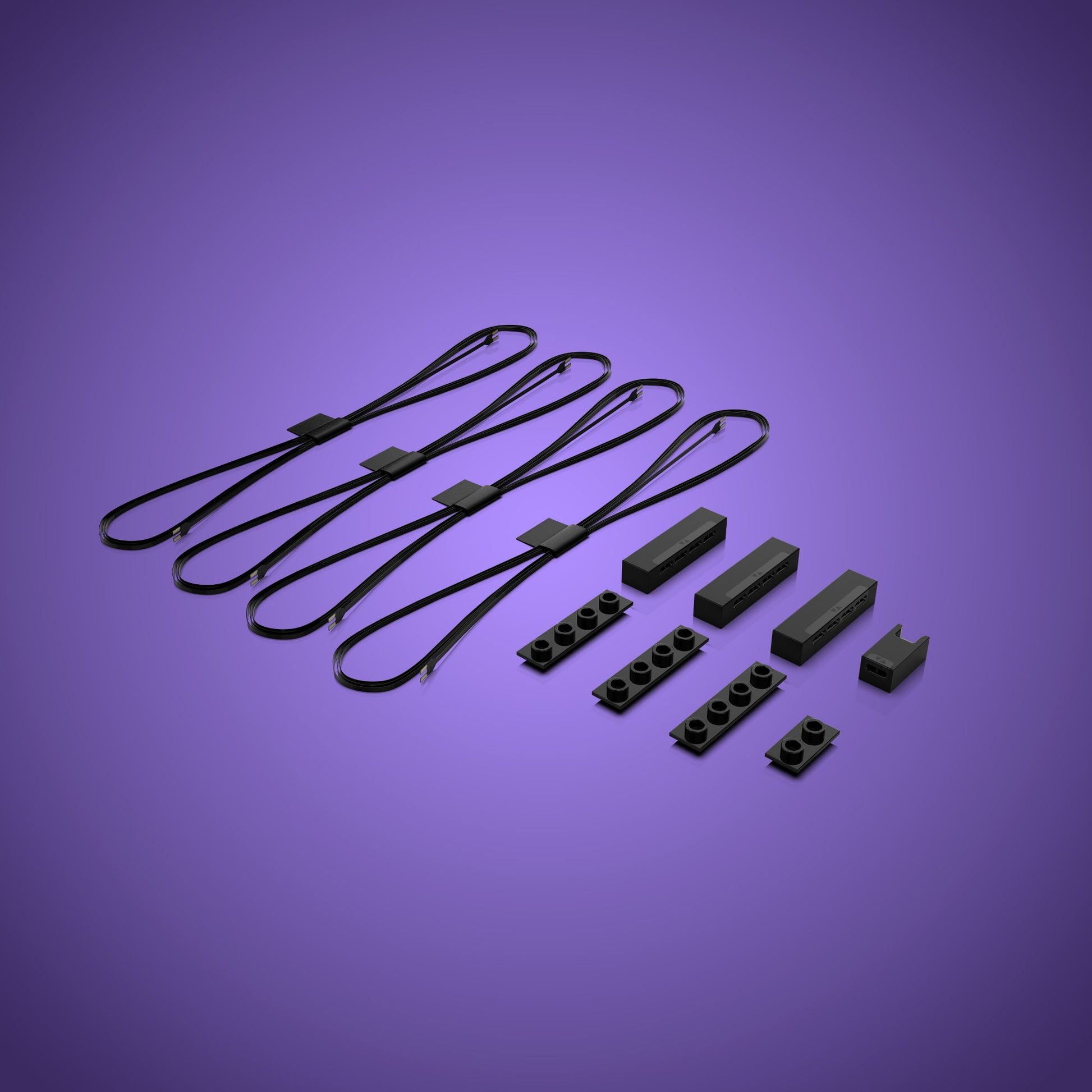 Mit den enthaltenen Leinen können Sie Stromverteilungszentren in Ihrem Aufbau leicht verbergen, um ein sauberes, nahtloses Finish zu erzielen. Das Konverter-Dock ermöglicht es Ihnen, Lichtkits der Version 1.0 mit Komponenten der Version 2.0 zu verbinden, während die Gürtel helfen, alles für eine einfache, effiziente Einrichtung zusammenzubinden.