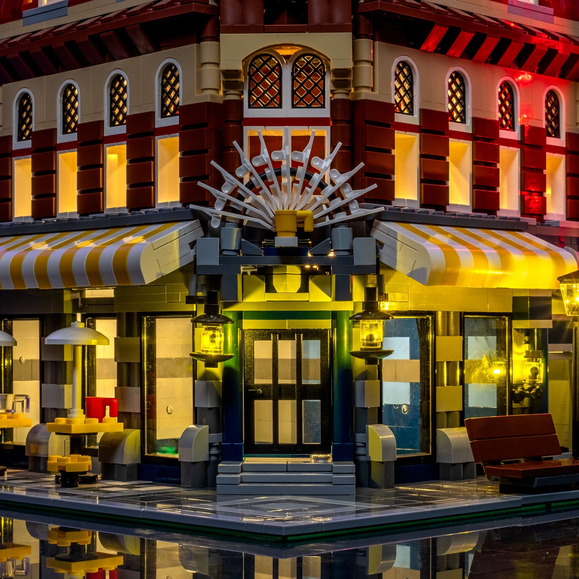 Light up LEGO® history with a custom Light My Bricks™ Light Kit for the LEGO® Creator Expert Café Corner 10182 — the original modular building brought to life in stunning detail. Warm white downlights illuminate each floor, adding vibrant brightness to the simple yet iconic interior, while our signature lit lamp post casts a welcoming glow across the street. Yellow-lit lanterns frame the entrances to both the café and apartments, creating a cosy, classic charm. The showstopper is the fully illuminated “HOTEL” sign, featuring six Micro Astro lights that give it a brilliant neon-style glow, making this timeless modular truly shine in your collection.