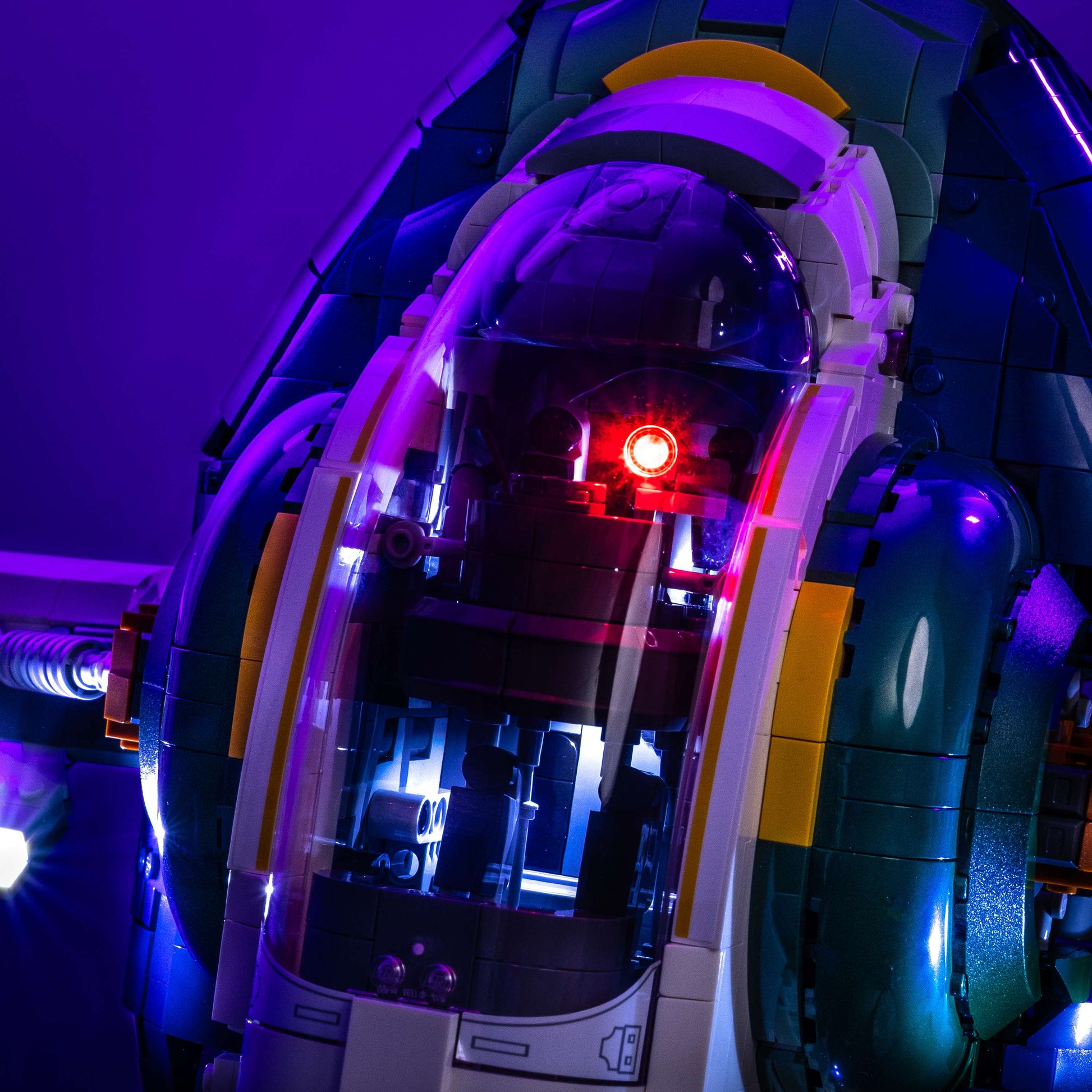 Bring cinematic presence and bounty hunter firepower to your LEGO® Star Wars Jango Fett’s™ Starship™ with our Light My Bricks™ lighting kit. Recreate the action from Attack of the Clones with Astro Regular Cool White lights on the wings for screen-accurate headlights, while six Astro Large Yellow lights and two Solar Warm White lights fire up the rear engine display for maximum visual impact. Twin Astro Regular Gun Effect Red lights glow inside the blaster cannons to replicate Jango’s intense laser fire.