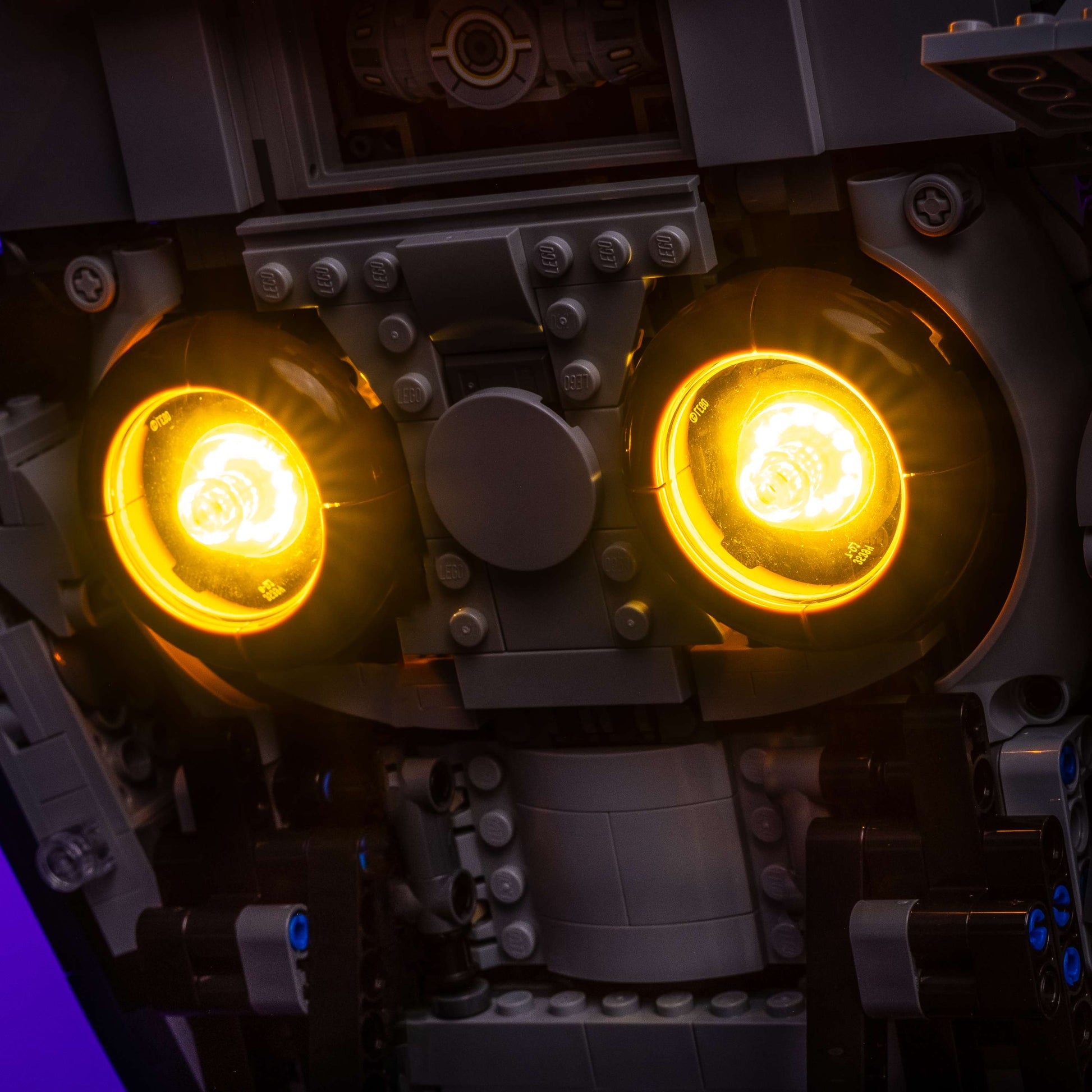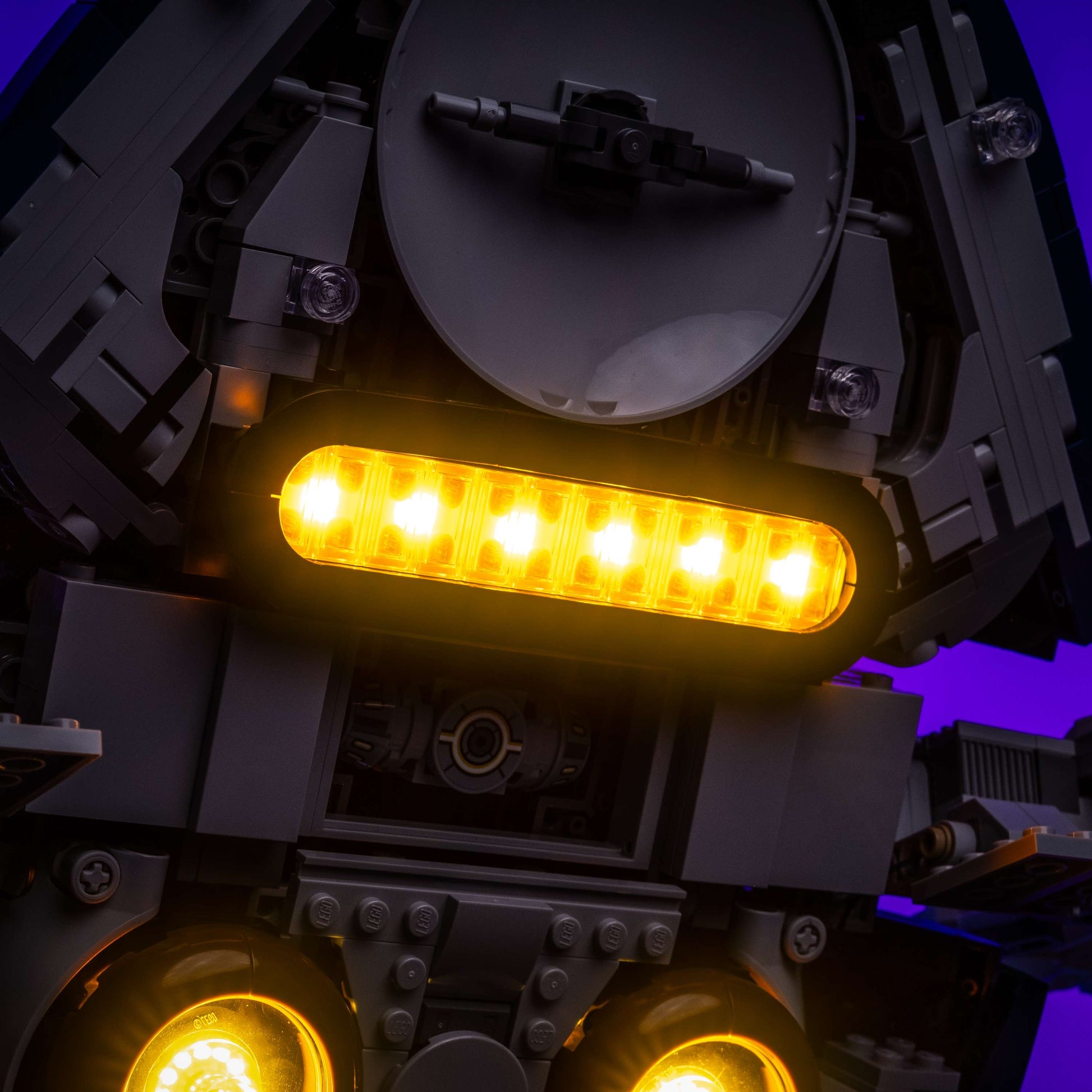 The cockpit features Astro Regular Cool White lights tucked away to illuminate the dark interior subtly, while an Astro Micro Red light beneath a trans-red plate recreates the ship’s targeting sensor. A hidden Astro Regular Cool White spotlight behind the boarding ramp activates when opened, illuminating the ship’s base with dramatic flair. Two more Astro Regular Cool White lights shine down on the display plaque for a polished UCS-style presentation.
