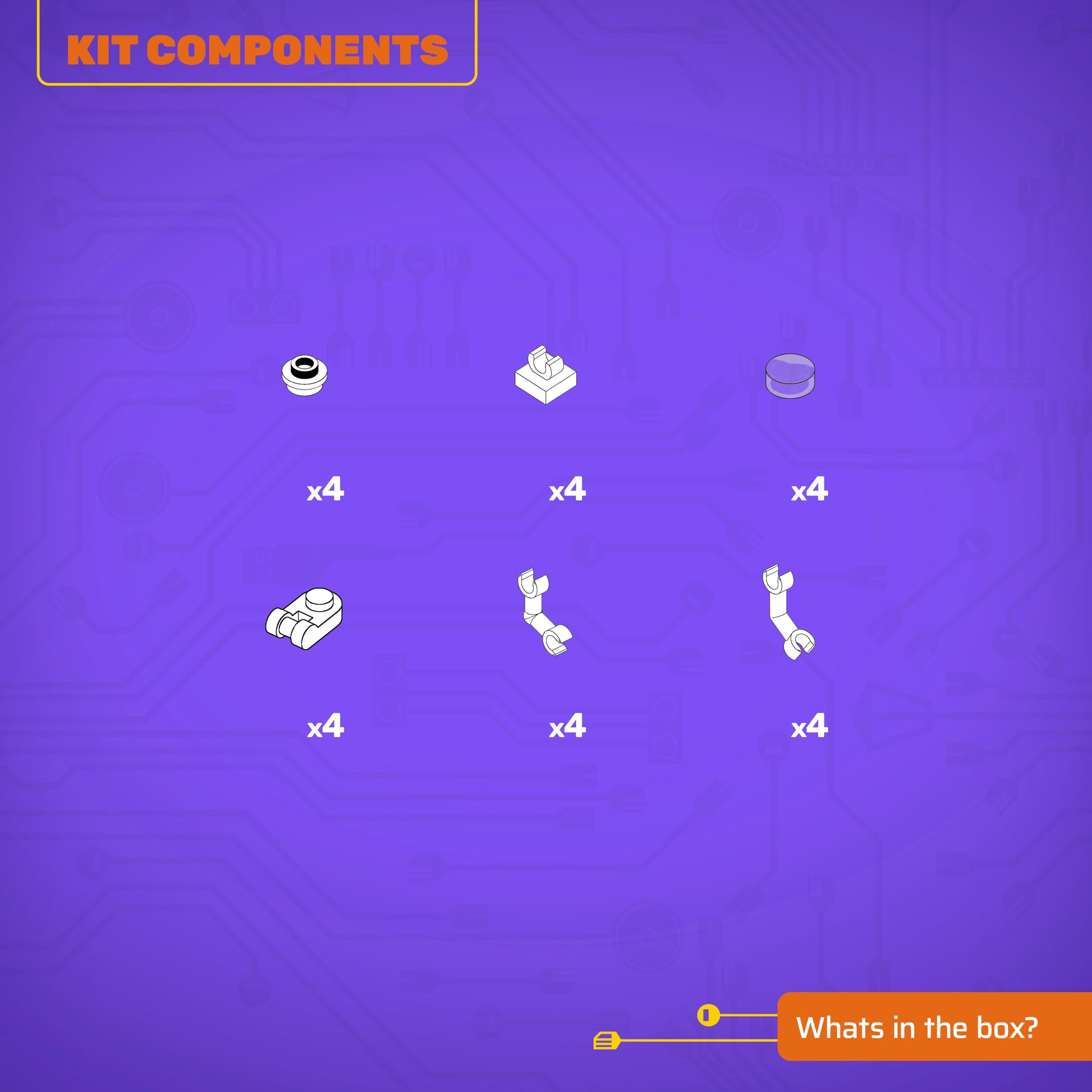 24 individual white brick pieces make it possible to assemble a total of 4 Spotlights. Optional building methods allow for different pivoting, hinging and connecting for full customisation.